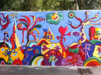 maternelle menée avec les élèves de maternelle. Fresque prévue sur le mur de la cour maternelle avec réalisation sur panneaux de bois.